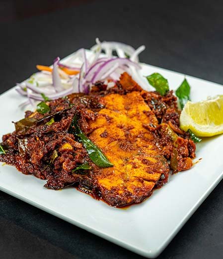 The fish—typically seer, pomfret, or sardine—is marinated in a blend of red chili powder, turmeric, black pepper, lemon juice, and crushed garlic. It is then shallow-fried or grilled on a hot tawa with coconut or gingelly oil until golden brown and lightly charred. A final garnish of curry leaves or sliced onions adds freshness and aroma.